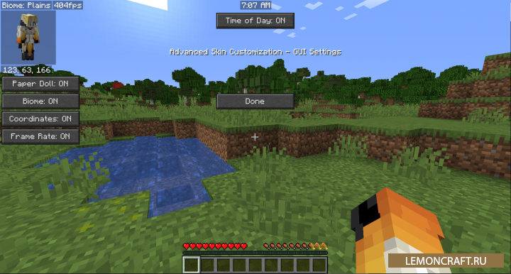 Мод на настройку скина персонажа Advanced Skin Customization предназначен для изменения главного меню игрока находящегося на главном экране, а так же изменяет вид от первого лица. Теперь вы сможете видеть все тело своего персонажа вместе со скином. Реалистичность повышается тем, что если вы смотрите наверх, то рук вы не увидите.